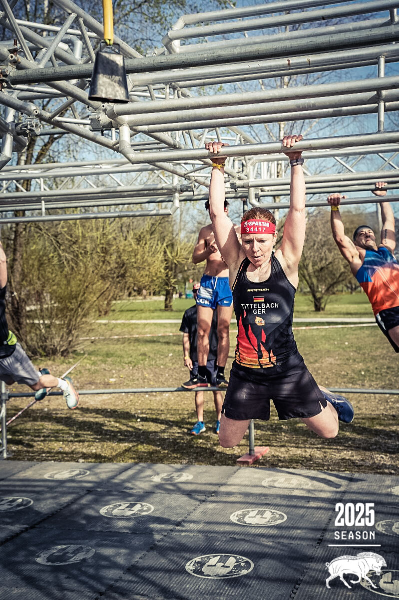 Zurück auf dem Eventgelände, fanden wir uns irgendwie alle am Stand des OCR-Munich zusammen, tauschten noch unsere Mimimis aus, alle nochmal zum Angst-Pippi und dann ging es auch schon los. Nach dem Startschuss wartete schon der gemeine Anstieg, naja, war das Adrenalin gleich wieder draußen. Die Hindernisse liefen erstaunlich fluffig - Beater, B-Beam, alles glatt, auch fast alle anderen Nettigkeiten flutschten irgendwie. Nur eben nicht - Speer und Slackline. Was für ein Schrott. Die Strafen kosteten übel Zeit und wenn am Ende nur ein paar Sekunden am Treppchen fehlen, ist das einfach nur sehr dumm gelaufen. Alles in allem - ein wirklich schönes Rennen, selbst das Wasser hat seinen Schrecken verloren (Grüße an den Arnstädter Beckenrand ;-) ).